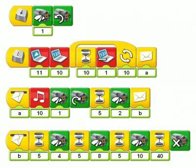 Вторая программа разделяется на три линии с использованием "почта" блоки, чтобы перейти от конца одной строки на начало следующей. Программа выполняется, когда буква "L" нажата. Во-первых, фона экрана выбран, и число "10" показано на рисунке. Затем цикл начинается отсчет времени, что, в 10 раз, ждет немного, а затем подсчитывает одну цифру. В конце обратного отсчета зажигания звук воспроизводится и пуск двигателя по часовой стрелке сделать рулонные строку и подъема ракеты в космос. Скорость увеличивается в несколько шагов от "1" до "10". В конце концов, двигатель останавливается.