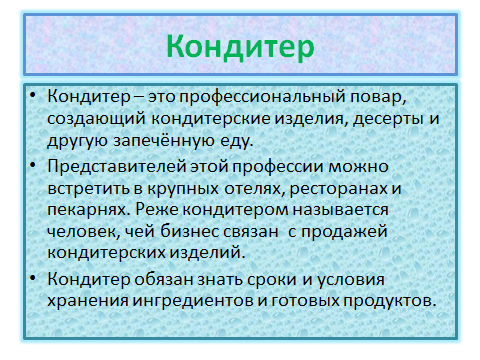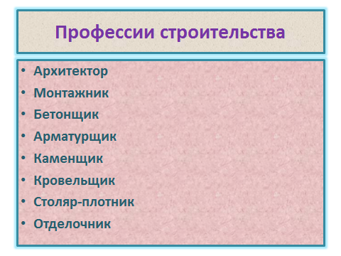Пожарный, врач, слесарь, швея, столяр, учитель, няня, нефтяник, официант, библиотекарь, дворник, повар, воспитательница, пекарь, шофёр, парикмахер.