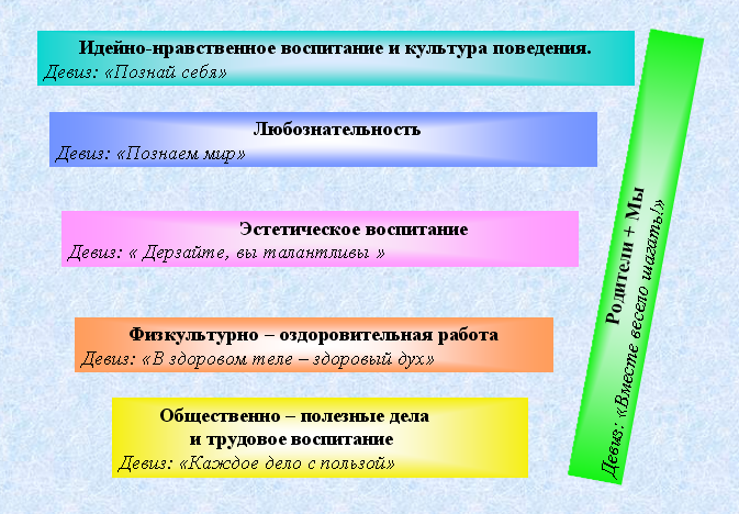 Воспитательная работа по программе «В путь по Радуге» организуется по направлениям, каждое направление имеет свой девиз, цель и реализуется в рамках игры-путешествия, в определенный день месяца.