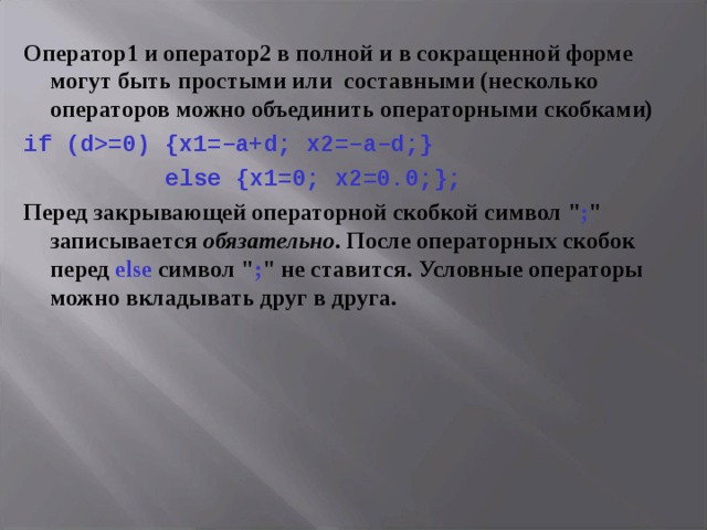 =0) {x1=–a+d; x2=–a–d;} else {x1=0; x2=0.0;}; Перед закрывающей операторной скобкой символ " ; " записывается обязательно . После операторных скобок перед else символ " ; " не ставится. Условные операторы можно вкладывать друг в друга. " width="640"