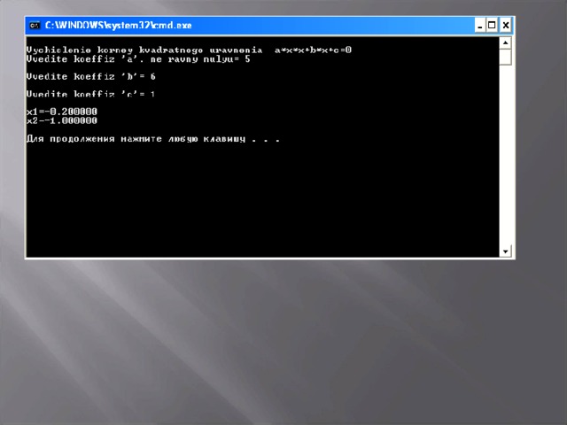 printf("\nVychislenie korney kvadratnogo uravnenia ax*x+bx+c=0");