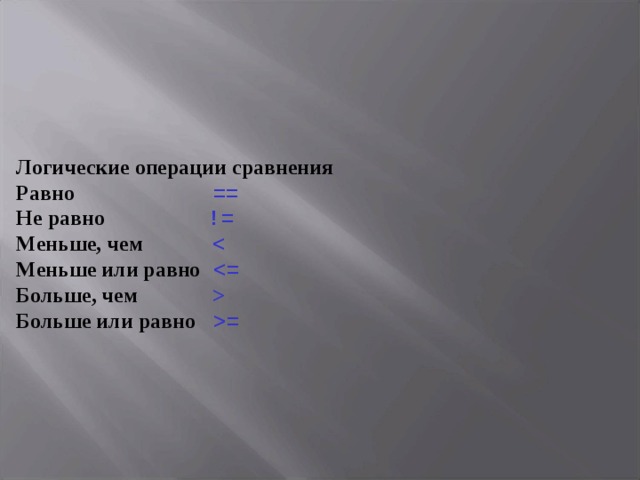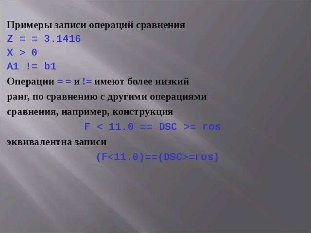 0 A1 != b1 Операции = = и != имеют более низкий ранг, по сравнению с другими операциями сравнения, например, конструкция F DSC = ros эквивалентна записи ( F DSC = ros ) " width="640"
