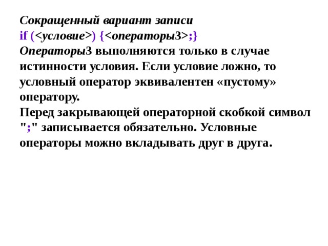 Сокращенный вариант записи if ( условие ) { операторы 3 ;} Операторы 3 выполняются только в случае истинности условия. Если условие ложно, то условный оператор эквивалентен «пустому» оператору. Перед закрывающей операторной скобкой символ " ; " записывается обязательно. Условные операторы можно вкладывать друг в друга.