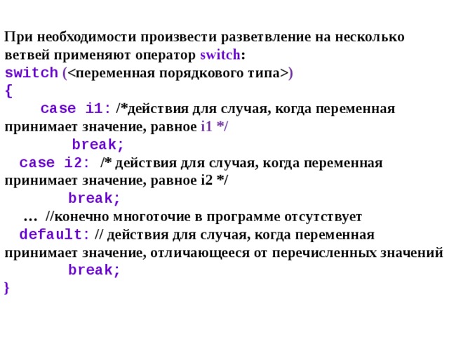 ) { case i 1: /*действия для случая, когда переменная принимает значение, равное i 1 */ break; case i 2: /* действия для случая, когда переменная принимает значение, равное i 2 */ break ; … //конечно многоточие в программе отсутствует default : // действия для случая, когда переменная принимает значение, отличающееся от перечисленных значений break ; } " width="640"