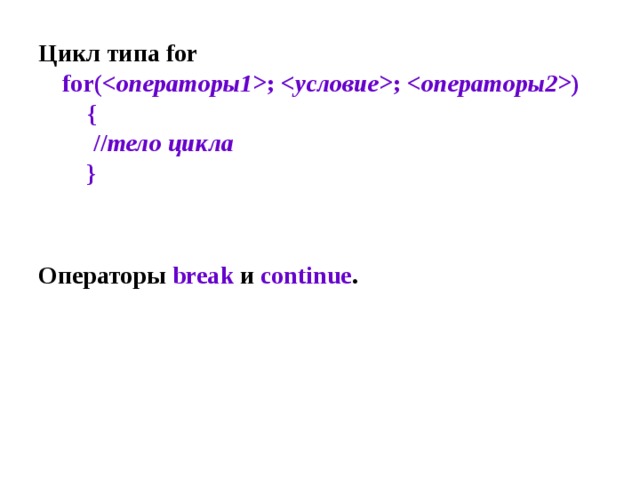 ; условие ; операторы2 ) { // тело цикла } Операторы break и continue . " width="640"