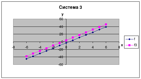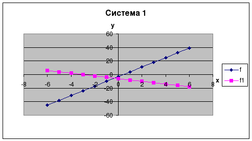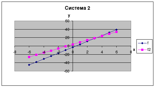 С помощью ЭТ предложить учащимся решить более сложные системы линейных уравнений графическим методом. Например,