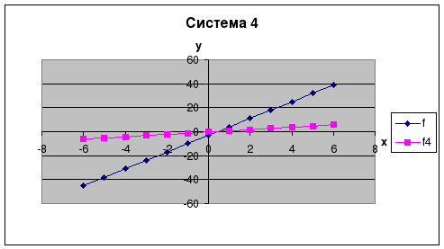 Составьте диаграммы для первой системы линейных уравнений на основе данных столбцов x, f, f1 и для второй системы - на основе данных столбцов x, f, f2. Аналогичным образом постройте диаграммы для третьей и четвёртой систем, используя данные столбцов x, f, f3; x, f, f4.