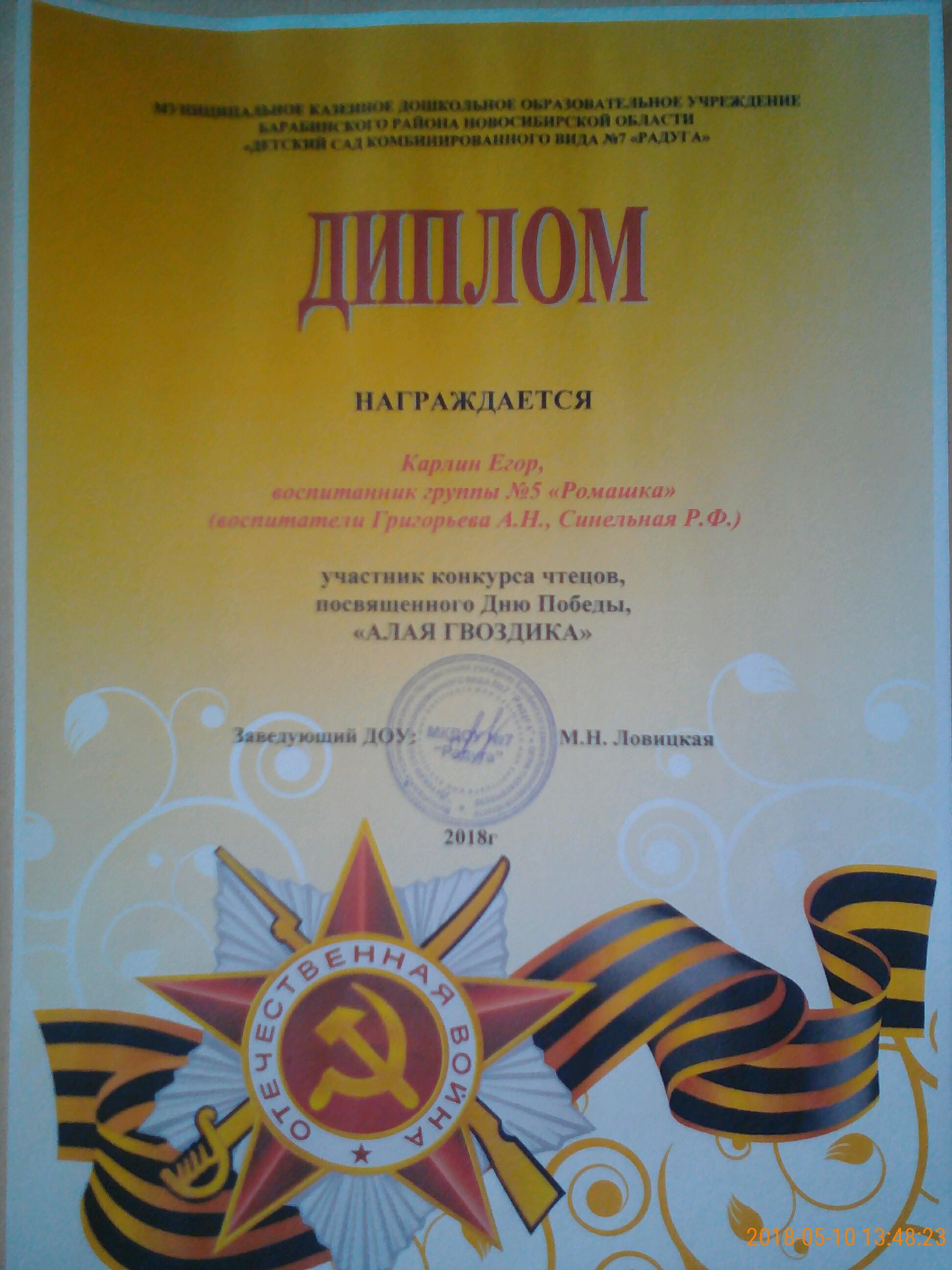 Результат участия в конкурсе чтецов, посвященного Дню Победы, «АЛАЯ ГВОЗДИКА»