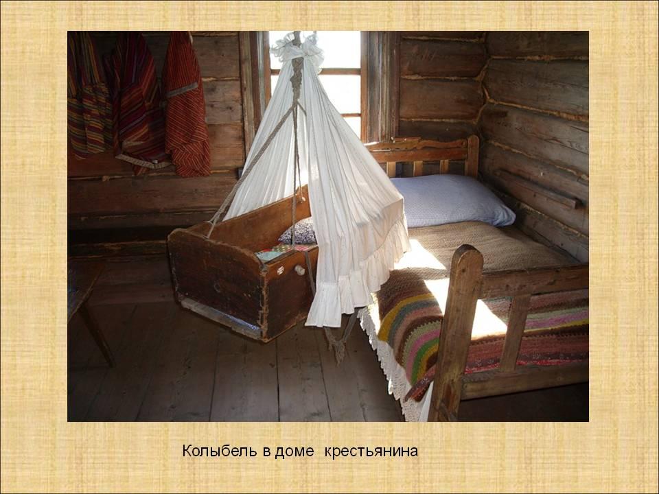 На Руси колыбели изготавливалась из разнообразных пород дерева, ивовых прутьев. Колыбель представляла собой небольшую люльку, подвешенную к потолку избы. Часто колыбель подвешивали на очеп – специальную гибкую палку.