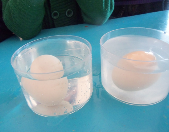 Ход опыта: воспитатель предлагает детям взять 3 банки: две пол-литровые и одну литровую. Одну банку наполнить чистой водой и опустить в нее сырое яйцо. Дети определяют, что в пресной воде яйцо тонет. Во вторую банку наливают крепкий раствор поваренной соли (2 столовые ложки на 0,5 литра воды). Опускают туда второе яйцо и определяют, что в соленой воде оно плавает.