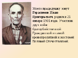 Иванов Егор представил на уроке очень интересную информацию о своем прадедушке Герасимове Иване Григорьевиче, который был участником двух воин: Гражданской 1918-1920г.г., Великой Отечественной войны 1941-1945г.г.. Егор вместе с мамой создали презентацию и газету – альбом, с информацией и фотографиями о прадедушке.