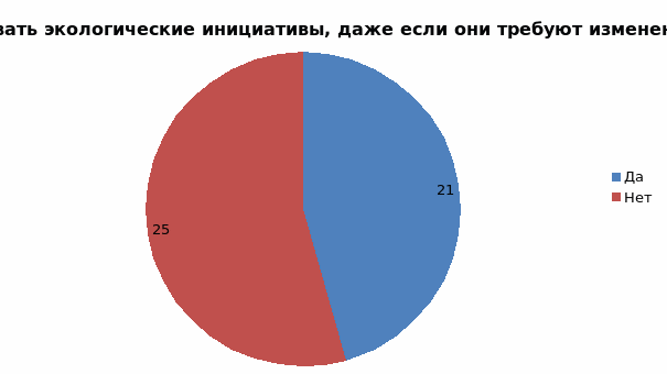 Пятый вопрос о готовности поддерживать экологические инициативы показал близкое распределение ответов: 45.7% готовы поддерживать, и 54.3% — нет. Это отражает разнообразие мнений и позиций в отношении личного вклада в решение экологических проблем.