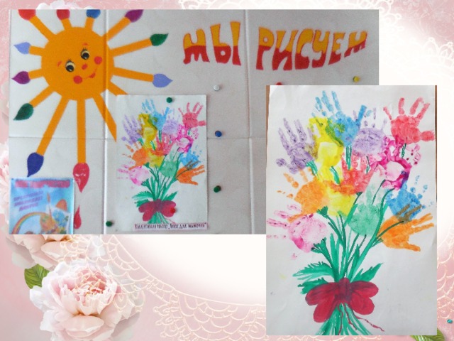 - Художественно – творческая деятельность: аппликация «Открытка для мамы», коллективная работа «Букет для мамы» с использованием нестандартной техники рисования в рамках кружка (рисование ладошками, рисование мамы, своей семьи в режимные моменты).