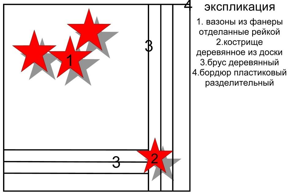 Малые архитектурные формы (МАФ - см. Приложение 4) в форме звезд в разных высотах с красными цветами (бегония всегдацветущая бронзовый лист, красная) - говорят о разных поколениях, что хранили, хранят и будут хранить память о погибших и живых победителях.