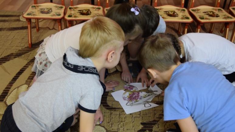 Ведущая. Ребята, совсем недавно ко мне приходила в гости мышка. Она нечаянно махнула хвостиком и разбила мне два предмета посуды. Помогите мне её собрать, и мы узнаем, что же разбила мышка-норушка.