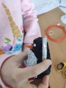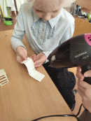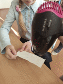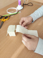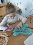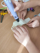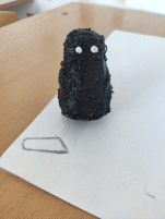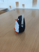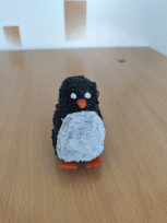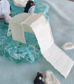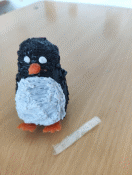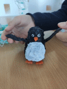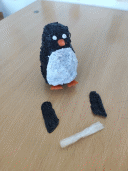 После того, как пингвин был раскрашен, мы сделали подвижные элементы, крылья у пингвина - мамы. Для этого, на теле пингвина, с двух сторон туловища сделали скобы. Для придания изогнутой формы использовали скотч, скрученный в трубочку. А на крылышках сделали крючки, которые цепляются за скобы, что позволило крыльям пониматься и опускаться.