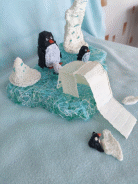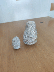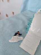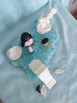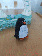 Были сделаны два маленьких пингвина. Один купается в воде, а другой находится возле мамы и ест рыбку. Также в гнезде у мамы находится яйцо, которое она зорко охраняет.
