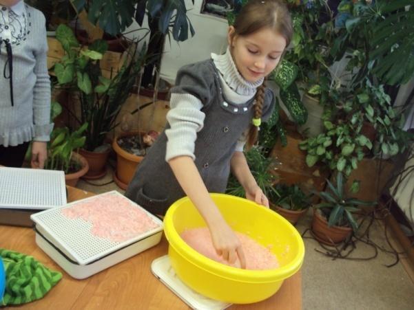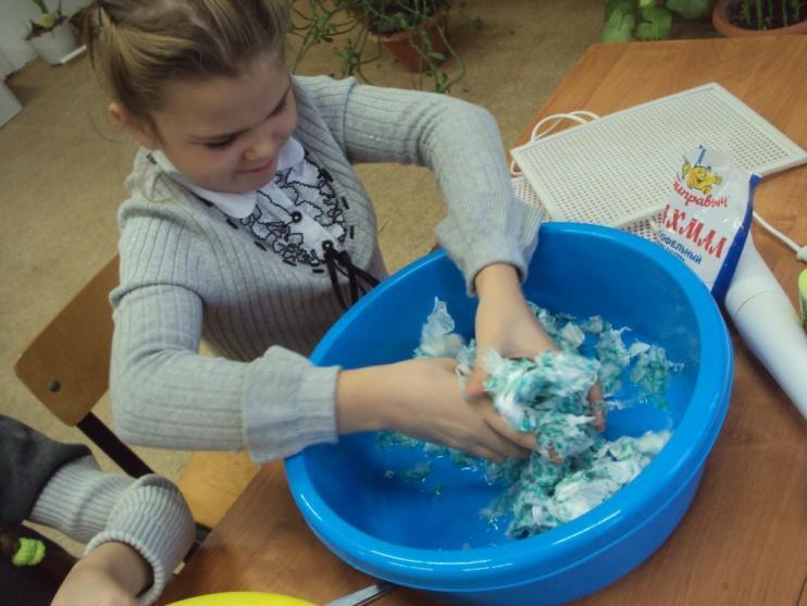 Фото, где наливает воду в чашку с бумагой. Фото где перемешивает руками