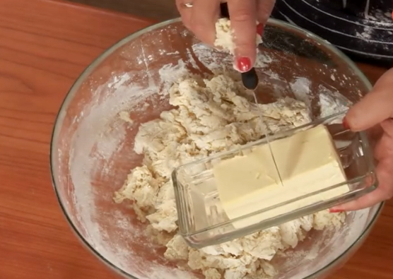 5. Добавляем в тесто жиры. Для этого сливочное масло предварительно размягчаем до мягкости. Вмешиваем масло и месим тесто.