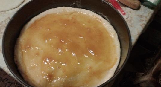Из двух частей раскатываем лепешки толщиной 1-1,5 сантиметра, на одну - выкладываем начинку – яблочное повидло.