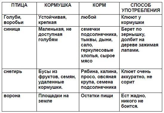 Изучив литературу, мы составили таблицу о видах корма для птиц, которых мы наблюдаем на территории школы(Приложение 3). Из таблицы видно, что основной корм для птиц семена подсолнечника (не жаренные, не солёные), семечки арбуза, дыни, тыквы, пшеничные отруби, овсяные хлопья, пшено, крошки белого хлеба, несолёное свиное сало, говяжий жир. Мясо и сало можно давать сырое и варёное, но обязательно несолёное. Белый хлеб нужно, предварительно подсушив, мелко растолочь – крупные замершие куски они не смогут клевать. Чёрный ржаной хлеб птицам вреден. Нельзя предлагать птицам (перловую крупу, горох и чечевицу), разбухая в желудке, они могут вызвать мучительную смерть. Из круп птицы охотно любят поедать овсянку "Геркулес" и пшённую. Любят птицы клевать ягоды рябины. Каждый день мы наполняли кормушки различными видами корма и проводили наблюдения за кормушками в течение часа. Наблюдения проводились как на улице - на территории школы, так и из окна кабинета.