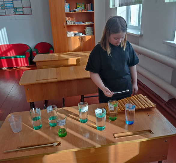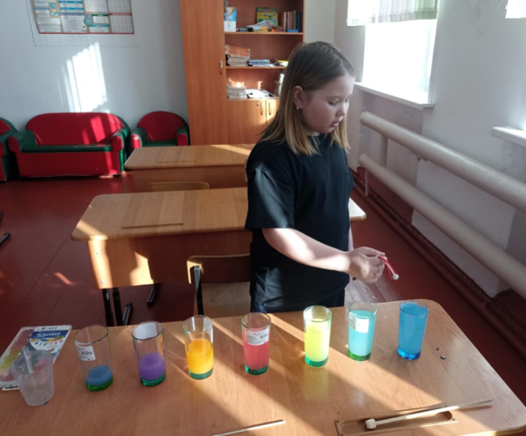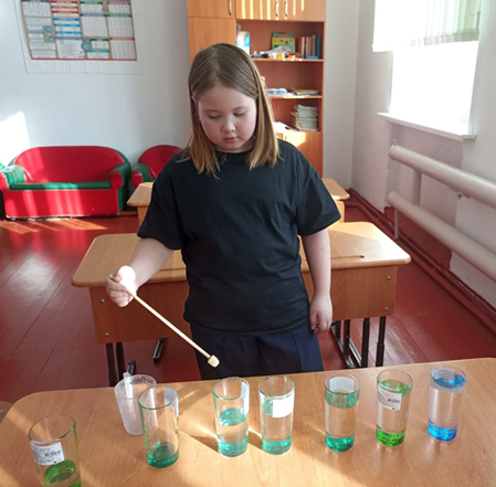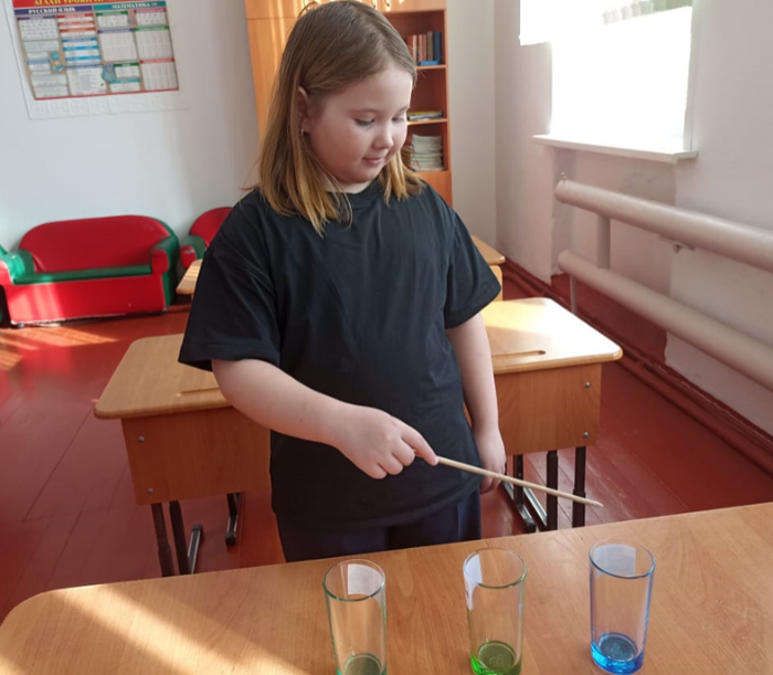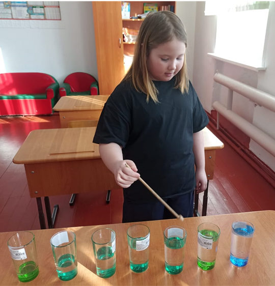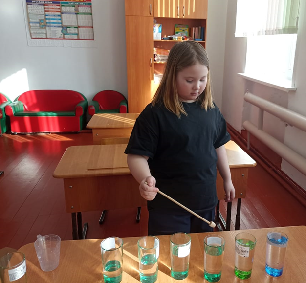 Вывод: если в одинаковые по высоте стеклянные сосуды наливать воды, с каждым разом уменьшая ее количество, то при поочередных ударах пластмассовой палочкой о стенки сосудов воспроизводятся звуки разной высоты.