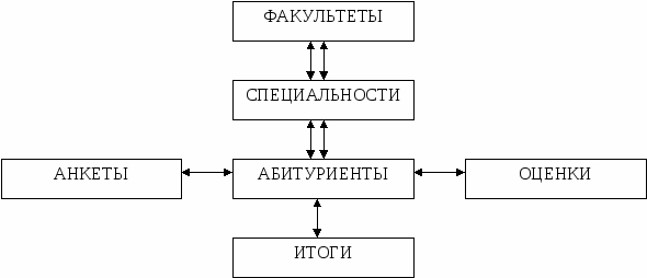Чтобы эти шесть таблиц представляли собой систему, между ними должны быть установлены связи. Связи позволяют определить соответствия между любыми данными в этих таблицах. Например: между фамилией абитуриента и его оценкой по математике. Благодаря этим связям становится возможным получение ответов на запросы, требующие поиска информации в нескольких таблицах одновременно.