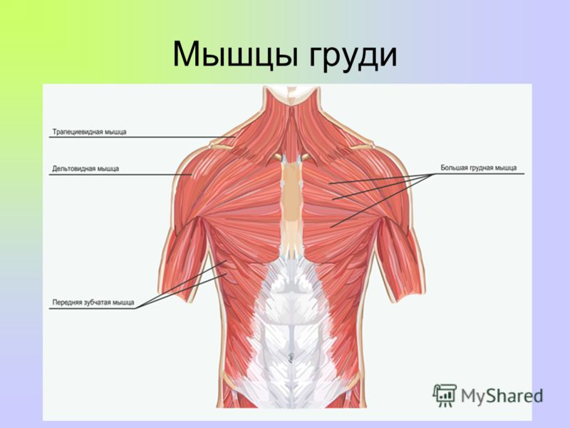 Мышцы груди делятся на мышцы груди, относящиеся к плечевому поясу и верхней конечности (большая и малая грудные мышцы, подключичная и передняя зубчатая мышцы), и собственные мышцы груди (наружные и внутренние межреберные мышцы). (смотри фото 2) [2 165]