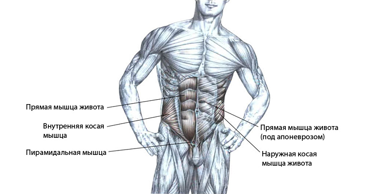 Мышцы живота представлены наружной и внутренней косыми, поперечной и прямой мышцами живота, а также квадратной мышцей поясницы.