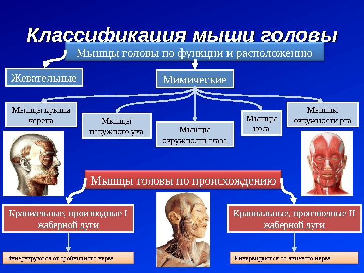 Все мышцы головы делятся на две группы: 1) мышцы лица и 2) жевательные мышцы. (смотри фото 4)