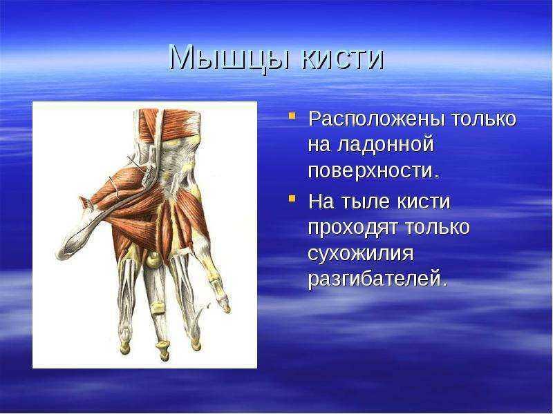 Мышцы кисти расположены только на ладонной ее поверхности. Они делятся на три группы: группу возвышения большого пальца, группу мышц ладонной впадины, или среднюю группу, и группу возвышения мизинца. Группу мышц большого пальца составляют четыре короткие мышцы: короткий сгибатель большого пальца кисти; короткая мышца, отводящая большой палец кисти; мышца, водящая большой палец кисти, и мышца, противопоставляющая большой палец кисти. Группу возвышения мизинца образуют три короткие мышцы: мышца, отводящая мизинец; мышца, противопоставляющая мизинец, и короткий сгибатель мизинца. (смотри фото 8) Средняя группа образована четырьмя червеобразными мышцами (сгибают основные фаланги) и межкостными мышцами. Последние заполняют межпястные промежутки и делятся на ладонные и тыльные. Ладонных межкостных мышц три, они сближают пальцы между собой, приводя их к средней линии. Тыльные межкостные мышцы, их четыре, разводят пальцы.