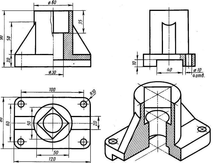 · на виде спереди и на виде слева выполнить соединение половины вида с половиной разреза.