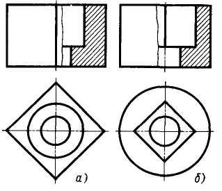 Если какая – либо проекция модели представляет собой фигуру, имеющую ось симметрии, то при выполнении разреза рекомендуется соединить половину вида с половиной разреза. И вид и разрез при этом освобождаются от линий невидимого контура. Пример изображения половины вида и половины разреза приведен на рисунке 2(в).