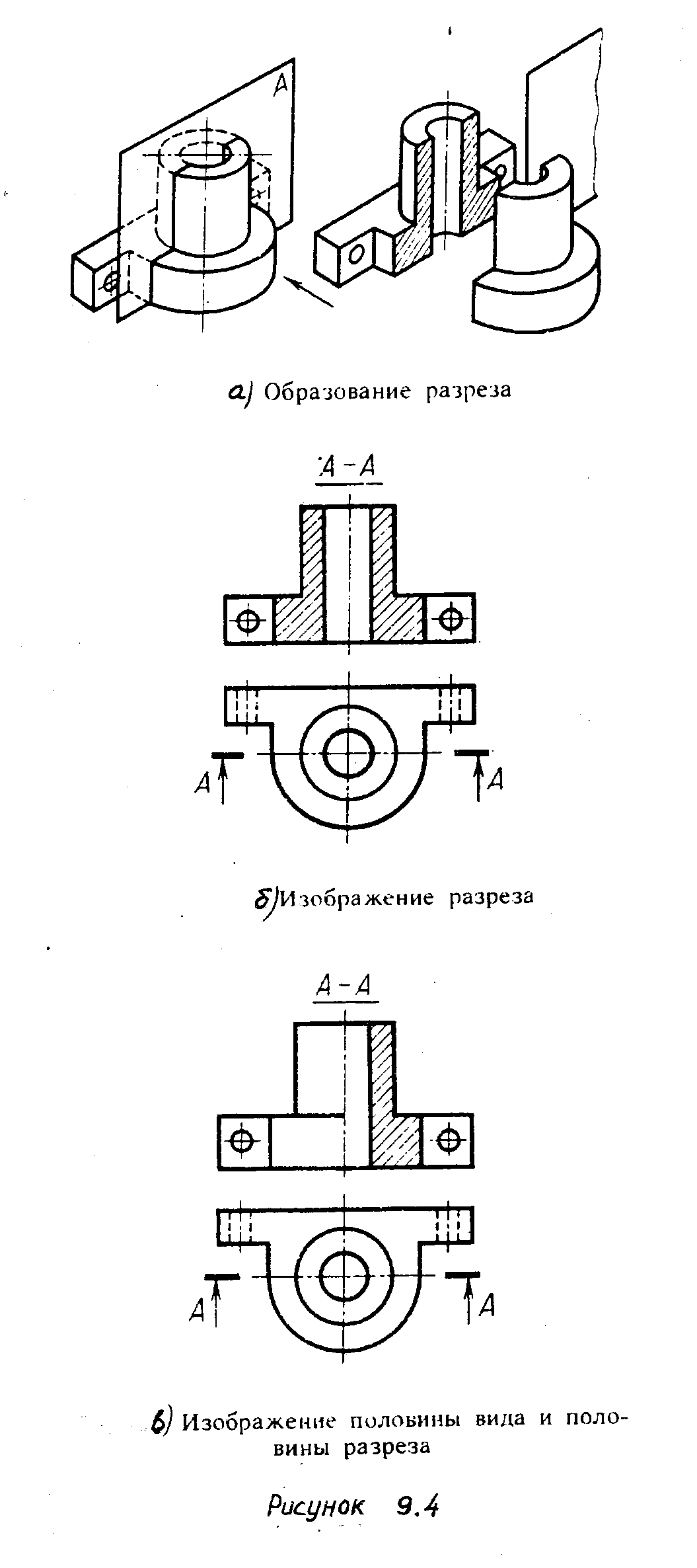 в) Изображение половины вида и половины разреза.