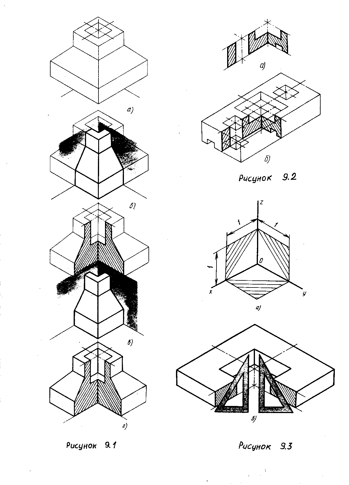 При первом способе вначале строят в тонких линиях аксонометрическую проекцию. Затем выполняют вырез, направляя две секущие плоскости по осям X и Y. Мысленно удаляют переднюю четверть, изображаемой модели, после чего штрихуют сечения и обводят изображения сплошными толстыми линиями. Этот вариант представлен на рисунке 3.1.