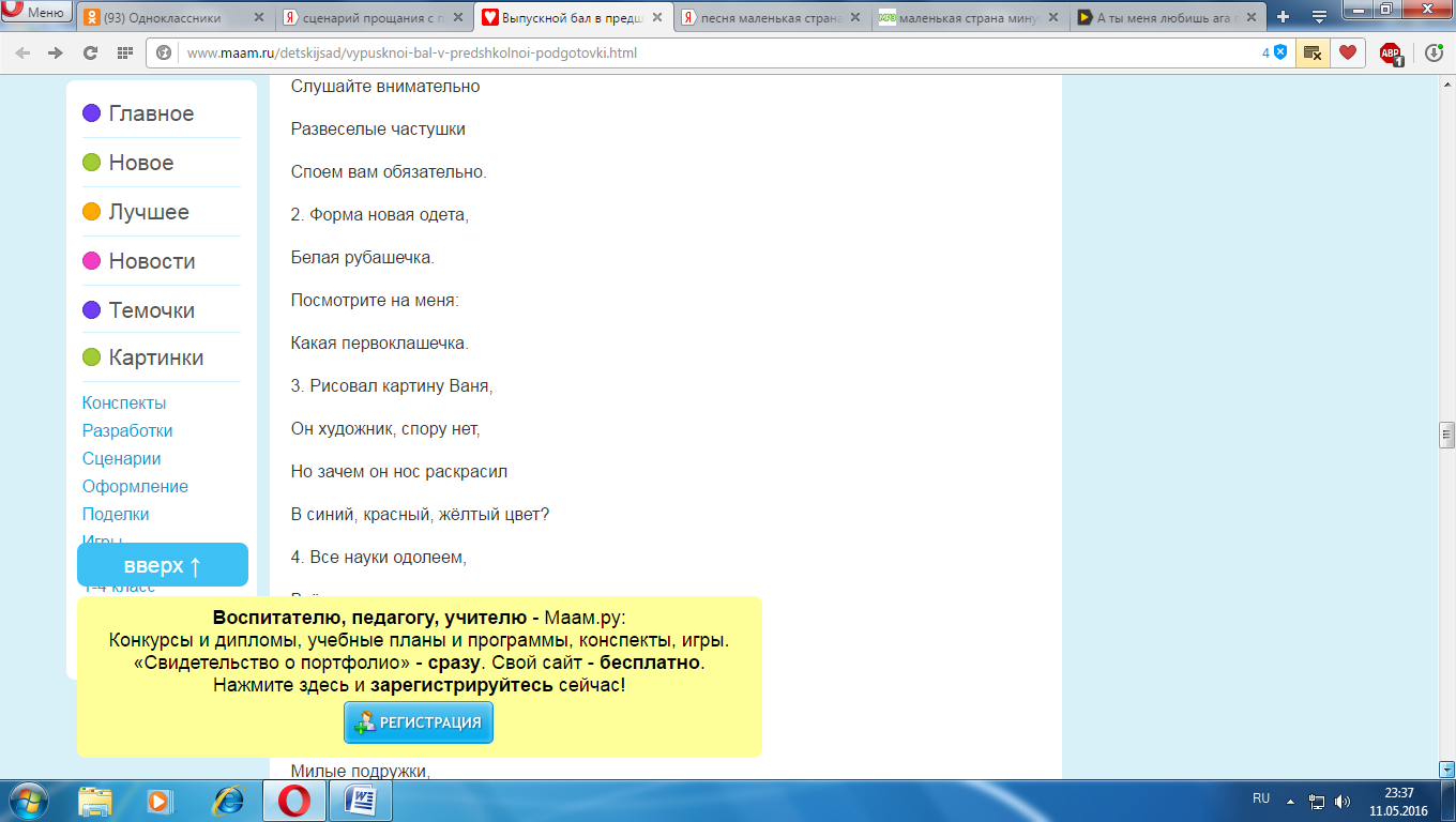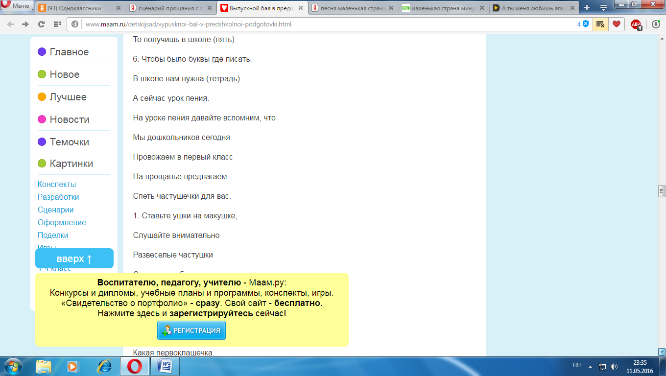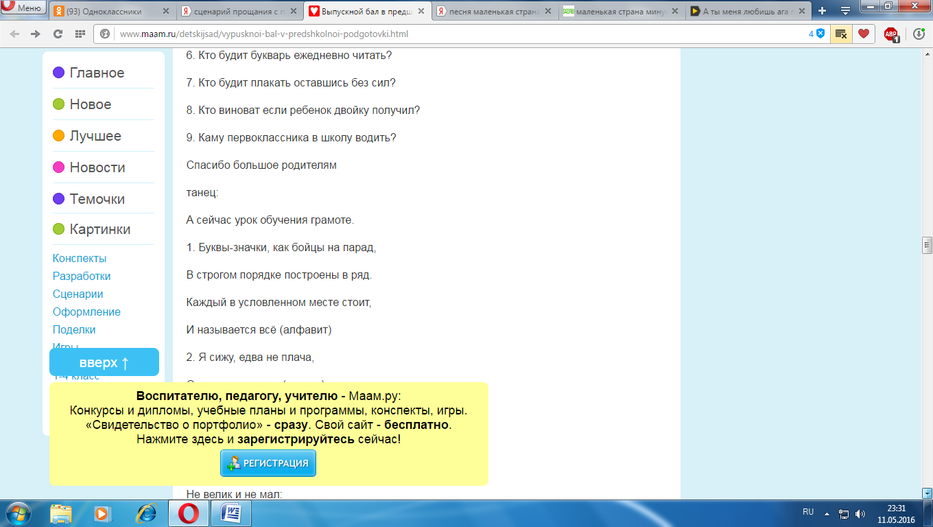 Ведущий: Добрый день, уважаемые мамы и папы, бабушки и дедушки! Здравствуйте гости и коллеги! Мы рады приветствовать Вас. Сегодня наша школа открывает свои двери для праздника, посвящённого нашим маленьким выпускникам, будущим первоклассникам. Для вас они всегда будут малышами, а для нас они самые умные, самые любознательные, самые весёлые дети, которыми мы гордимся и восхищаемся.