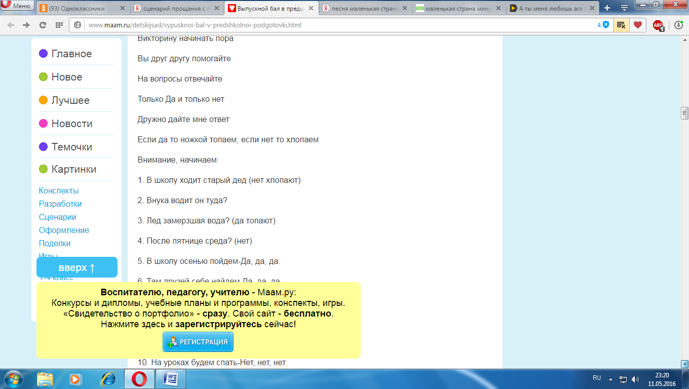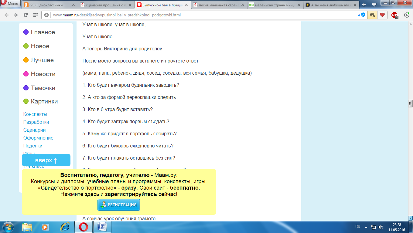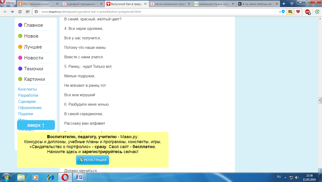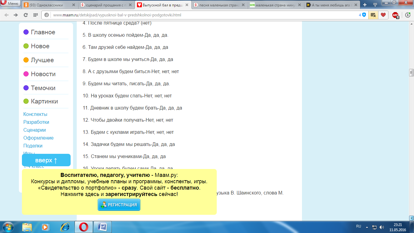 Ведущий: Добрый день, уважаемые мамы и папы, бабушки и дедушки! Здравствуйте гости и коллеги! Мы рады приветствовать Вас. Сегодня наша школа открывает свои двери для праздника, посвящённого нашим маленьким выпускникам, будущим первоклассникам. Для вас они всегда будут малышами, а для нас они самые умные, самые любознательные, самые весёлые дети, которыми мы гордимся и восхищаемся.