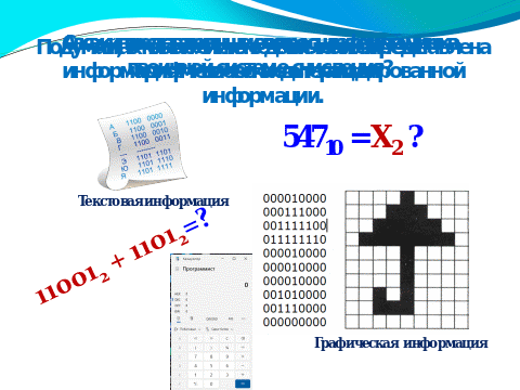 При переводе числа из одной системы счисления в другую используют Калькулятор. При этом необходимо поменять вид Калькулятора с Простого на Программный, для этого выбираем Главное меню (Пуск) – Калькулятор – Вид – Программный (Программист). В отличие от Простого появились дополнительные кнопки. Обратите внимание на кнопки Bin – двоичная с/с, доступны кнопки 0, 1.; Оct – восьмеричная с/с, доступны цифры от 0 до 7; Dec – десятичная с/с, доступны цифры от 0 до 9; Hex – шестнадцатеричная с/с. Доступны цифры от 0 до 9 и буквы от A до F. Ввод цифр производится двумя способами: ЩЛ мышки на Калькуляторе и с помощью клавиатуры.