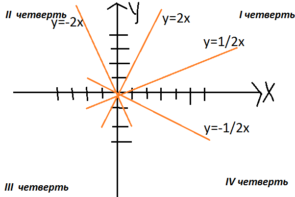 В одной системе координат построить графики функций : y=2x, y=-2x, y=1/2x,y=-1/2x.