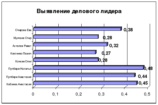 Актив класса в состоянии заинтересовать любого ученика различными видами деятельности. Так как актив выбирался путем голосования всех учеников класса, то можно говорить о том, что в его состав входят те учащиеся, к которым прислушиваются и которые служат примером для подражания большинства учеников класса. И это не странно, ведь командир класса наиболее успевающая ученица. Именно в таком составе ребята привлекаются к активному участию в жизни класса и школы, развитию межличностных отношений между одноклассниками и одношкольниками, сплоченности коллектива. Высказанное мнение подтверждается результатами проведенной в 10 классе социометрии, согласно которой Пулбери Анастасия и Кобзева Анастасия являются лидерами класса.