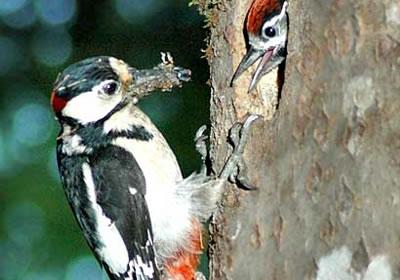Встречается в наших лесах также малый пестрый дятел – величиной чуть крупнее воробья. На голове у самца красная шапочка. Зимой и летом этот дятел кормится насекомыми. Ловко обследует щели и трещины на коре деревьев, долбит кору - достает личинок и жуков. Встречается малый пестрый дятел смешанных и лиственных лесах.