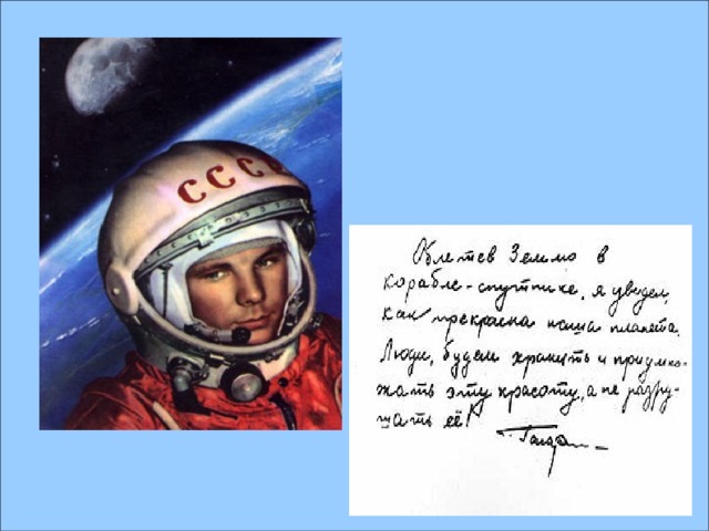 Дорогие друзья, близкие и незнакомые, соотечественники, люди всех стран и континентов! Через несколько минут могучий космический корабль унесёт меня в далекие просторы Вселенной. Что можно сказать Вам в эти последние минуты перед стартом?