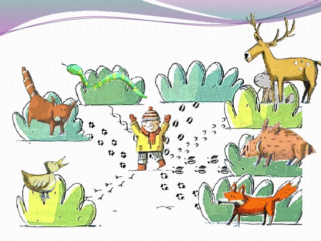 Если внимательно рассмотреть следы на снегу, легко догадаться, кто за каким кустом спрятался. Попробуй и ты отыскать зверей!
