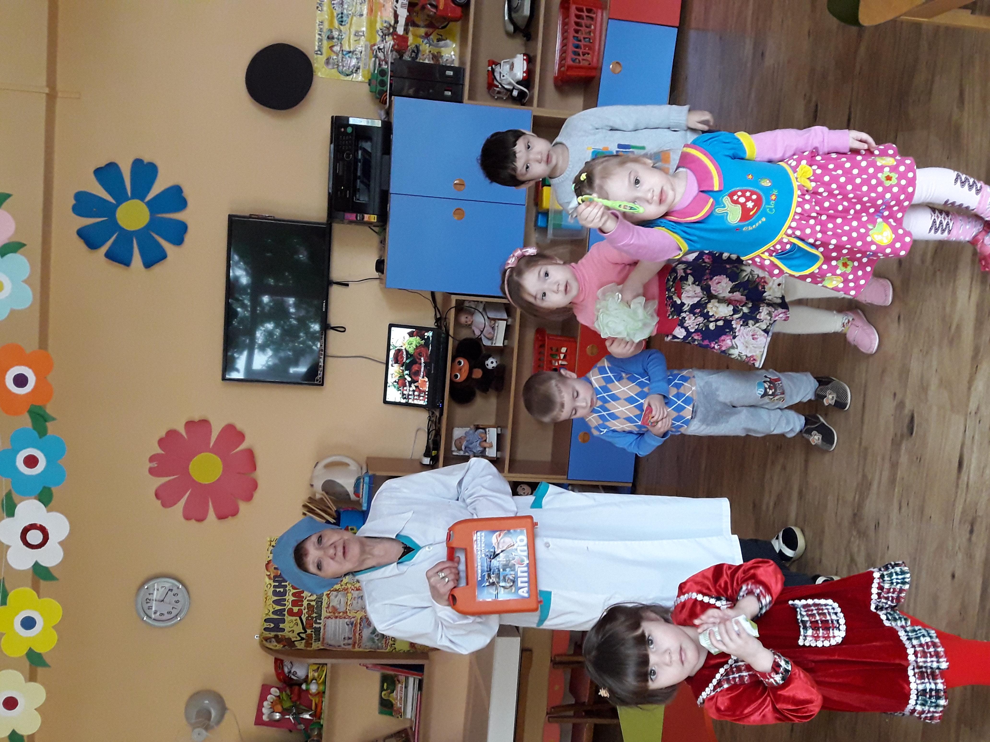 Входит «Доктор Айболит», здоровается с детьми. Спрашивает о сказке, в которой он живет, расспрашивает детей о здоровье и загадывает загадку.