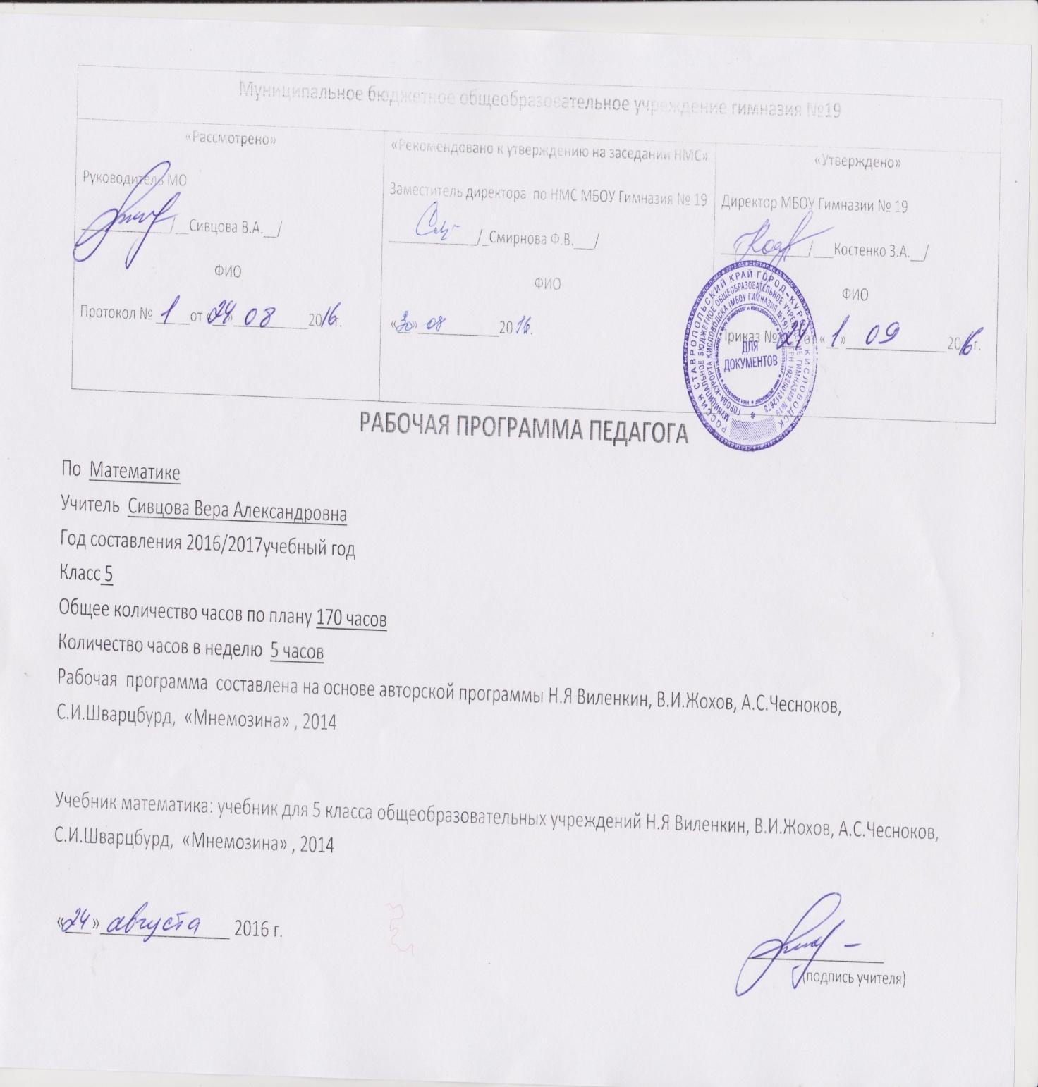 Рабочая программа по математике для 5 класса ориентирована на использование учебника Н.Я. Виленкина, В.И. Жохова и др. (М.: Мнемозина).