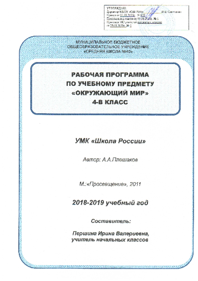 Рабочая программа по окружающему миру для 4 В класса составлена в качестве приложения к основной образовательной программе начального общего образования МБОУ «СШ № 40» на основе: