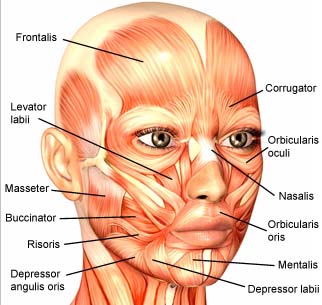 Мимические мышцы самые необычные. В отличие от остальных мышц, они располагаются сразу под кожей, у них нет фасций. Некоторые их них с одной стороны прикрепляются к костям, а с другой вплетаются в кожу, некоторые прикрепляются к связкам или берут от них начало. Мышцы отвечают за мимику нашего лица. Разнообразные комбинации сокращения мимических мышц придают лицу определённые выражения сложных ощущений (эмоций): радость, стыд, презрение, горе, боль.