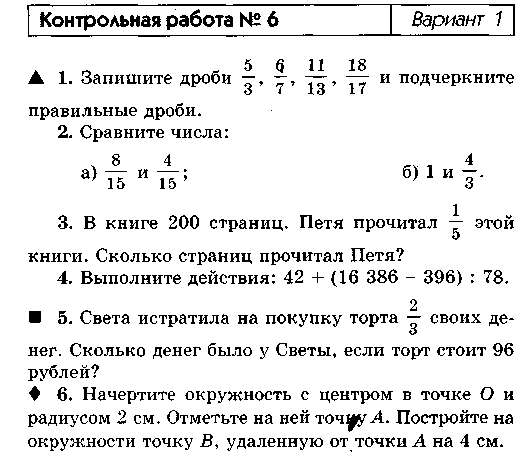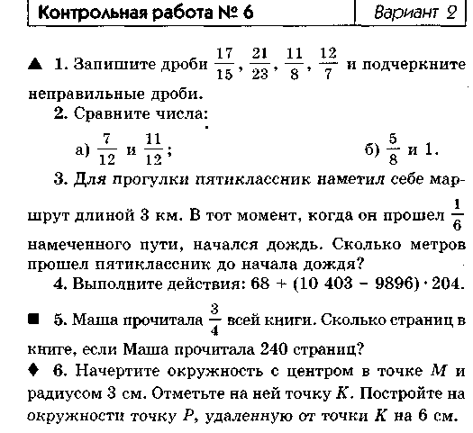 | Контрольная работа № 1 Вариант 2 ▲ 1. Начертите отрезок КМ и отметьте на нем точку Р. Измерьте отрезки КМ и РМ. Постройте отрезок АВ, длина которого 5 см 4 мм. Отметьте на нем точки С и D так, чтобы точка С лежала между точками D и В. На координатном луче, единичный отрезок которого равен длине одной клетки тетради, отметьте точки М(3), N(5), Р(7), T(13). Отметьте точки А и В. Проведите через них прямую. Начертите луч ОР, пересекающий прямую АВ, и луч MX, не пересекающий прямую АВ. Сравните числа: а) 2 000 050 и 2 005 000; б) 63 208 и 62 803. ■ 6. На координатном луче отметьте точку Е, если ее координата — натуральное число, меньшее 15, но большее 13. ♦ 7. Запишите пятизначное число, которое больше 99 988 и оканчивается цифрой 5. |