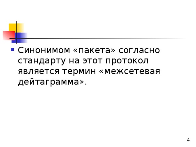 Данный протокол описывается стандартом RFC 791 (Request for Comments — запрос на комментарии). Согласно этому стандарту, межсетевой протокол имеет специально ограниченный набор задач, обеспечивающих функции, необходимые для передачи битового пакета, от отправителя к получателю через объединенную систему компьютерных сетей. Таким образом, данный протокол не имеет механизмов для увеличения достоверности переданных данных, управления потоками данных, синхронизации или прочих служб, обычно применяемых в протоколах передачи от хоста к хосту.