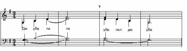 Альты поют упражнение до Ре первой октавы и возвращаются на исходную, сопрано поют до Си первой, ждут, когда альты споют свой оборот и присоединяются к ним с этой же ноты. Такты на три четверти просчитываются вслух или отмечаются телодвижением